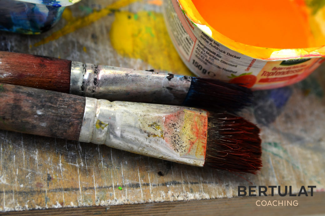 Weil ich weiß, wie ertragreich das künstlerische Arbeiten ist, habe ich es in meine Arbeit integriert. Pinsel und Leinwand. Vision Boards, die Ideen sichtbar machen. Formen aus Ton.